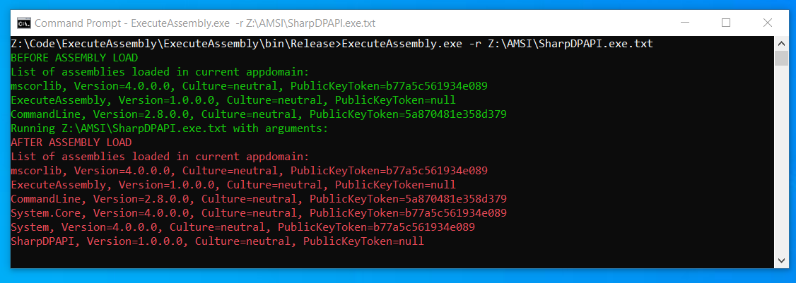 Running this code, we can see that SharpDPAPI is being loaded into the AppDomain of the application: